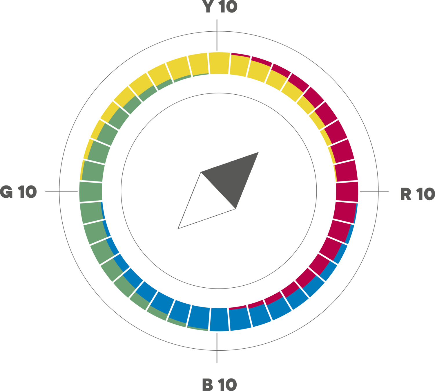 Ve vzorníku Cemix Color Compass jsou 4 základní barevné směry – žlutá (Y), červená (R), modrá (B) a zelená (G) – uspořádány do kruhu.