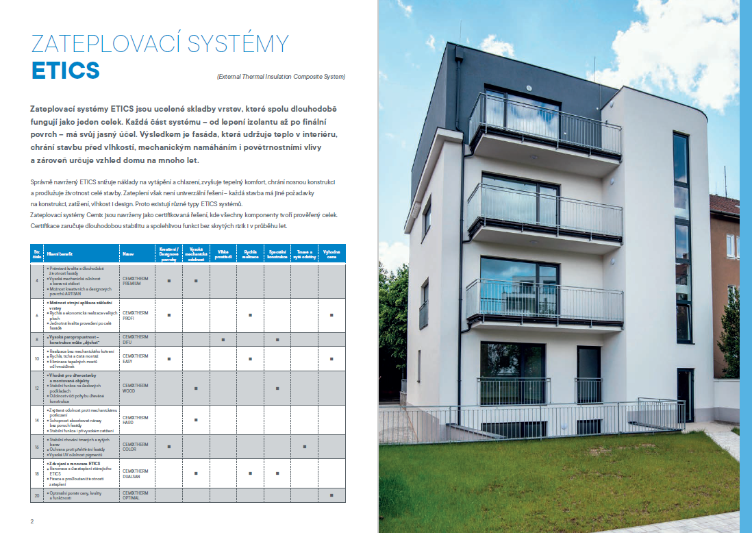 Představujeme ucelený přehled Cemix zateplovacích systémů ETICS, které vám pomohou zorientovat se ve správné volbě řešení pro různé typy staveb. Přehledně vysvětlujeme principy jednotlivých systémů, jejich hlavní přínosy i rozdíly z pohledu funkce, zatížení a designu. Tato brožura slouží jako praktický průvodce pro návrh dlouhodobě spolehlivé a kvalitní fasády.