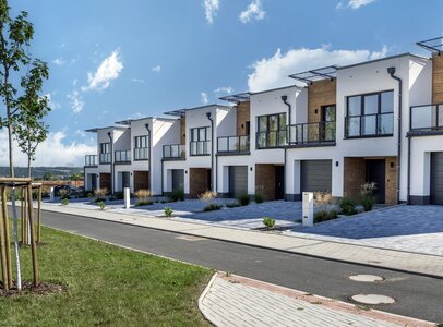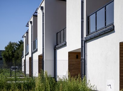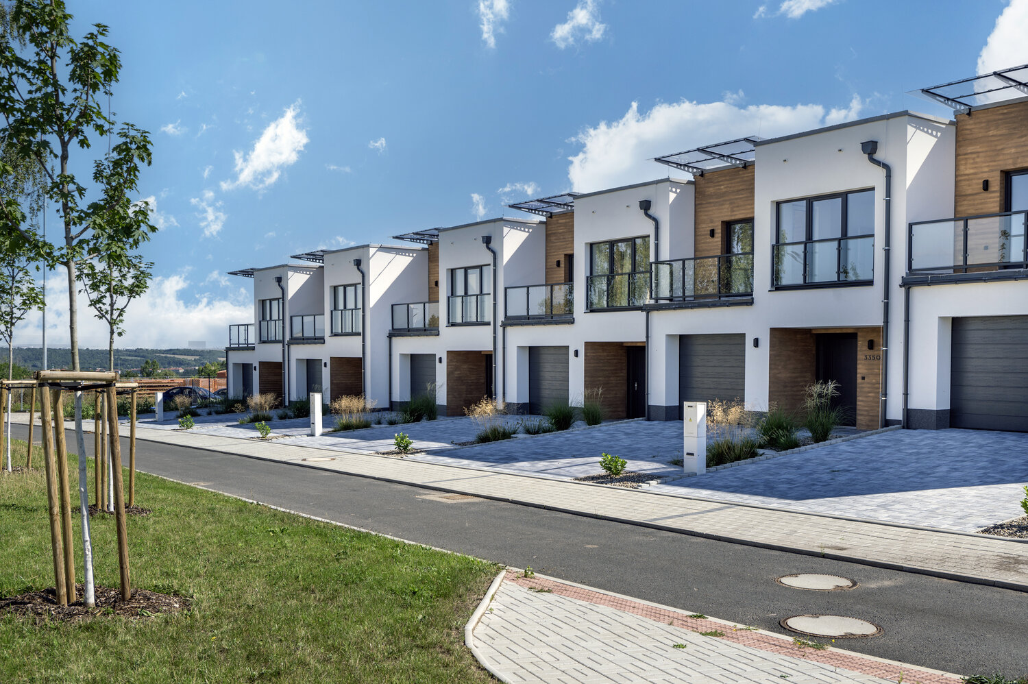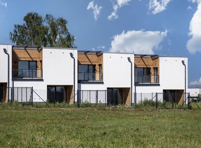 Řadové rodinné domy Na Homoli byly v lokalitě bývalých kasáren postaveny z broušených cihel v systému jednovrstvého zdění, tedy bez dodatečného zateplení. Fasáda zaujme na první pohled kombinací světlé omítky a dekoru dřeva. Při bližším pohledu však vyjde najevo, že nejde o dřevěný obklad, nýbrž o precizní imitaci vytvořenou kreativním fasádním povrchem Artisan.