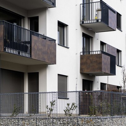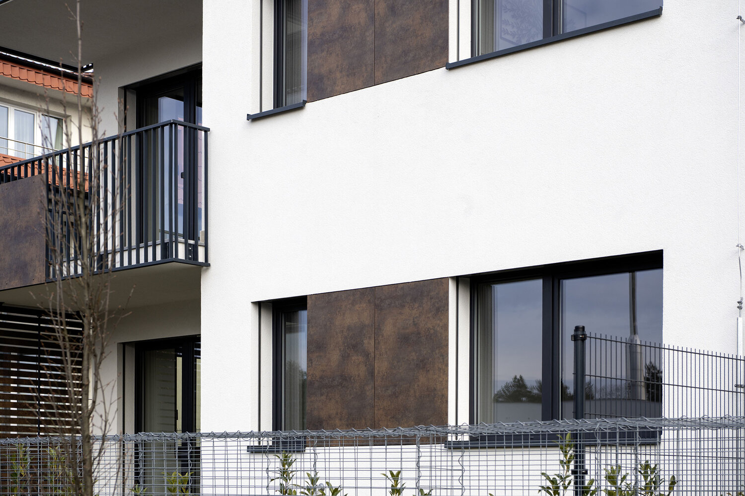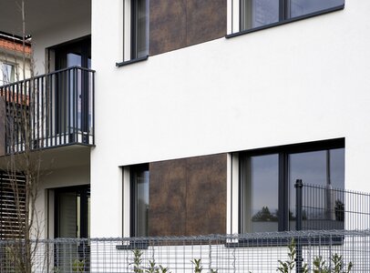 Architekturu fasády ještě vylepšily dekorativní desky Fundermax. Lokálně jsou připevněny pomocí konzolí (vetknuty do zdiva) na izolační desky. V místech, kde byly do fasády integrovány desky Fundermax, byla do skladby ještě navíc vložena protipožární vata a parozábrana. Desky s dekorem dřeva plošně lícují s finální omítkou na zbytku fasády.
