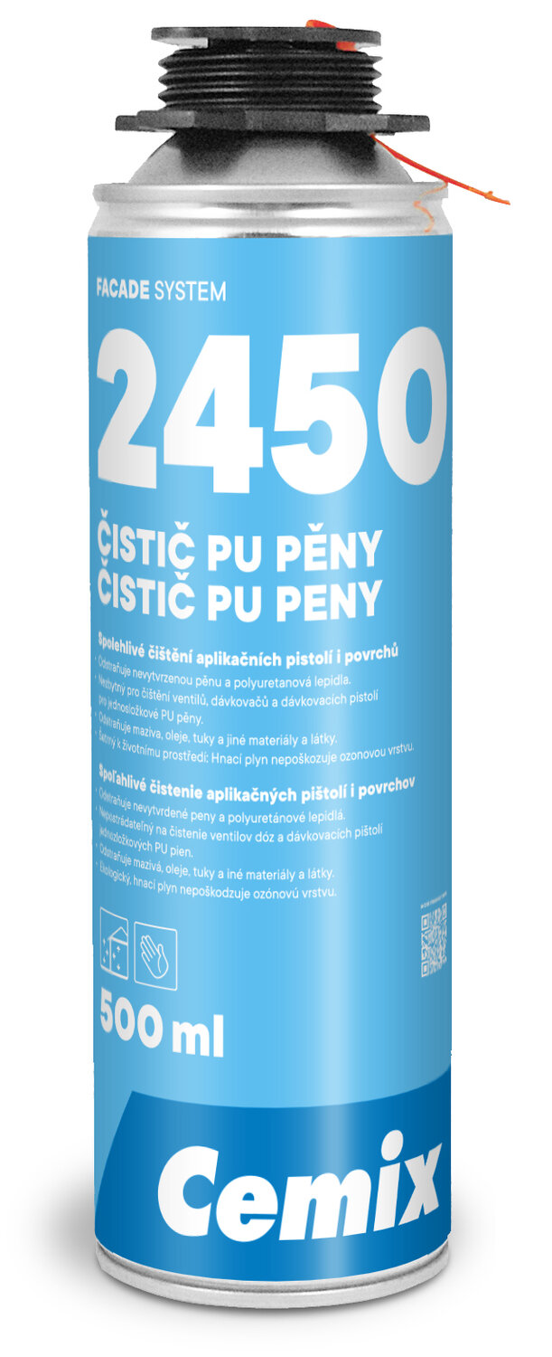 Při čištení pistolí nejpre odpojte pistoli od nádoby s pěnou a stisknutím páky pistole odstraňte zbylou PU pěnou z pistole. Nasaďte červenou sprejovou hlavici na kohoutek čističe a postříkejte ventil pistole. Nasaďte červenou aplikační hlavici na ventil čisticího prostředku a nastříkejte spojku - objímku pistole, sejměte červenou aplikační hlavici a vložte čisticí prostředek do objímky pistole.Opět stiskněte páku pistole. Postup opakujte k plnému očistění vnitřního mechanizmu pistole z pěny. Všechny čištěné povrchy pečlivě osušte.Při čištění na ventil přípravku 2450 nasaďte přiloženou červenou aplikační hlavici. Postříkejte čerstvé pěnové skvrny nebo skvrny PU lepidla. Při čištění znečištěného vývodu nádoby polyuretanové pěny důkladně nastříkejte čisticí prostředek na ventil a pistolový adaptér.Znečištění odstráňte suchým hadříkem.